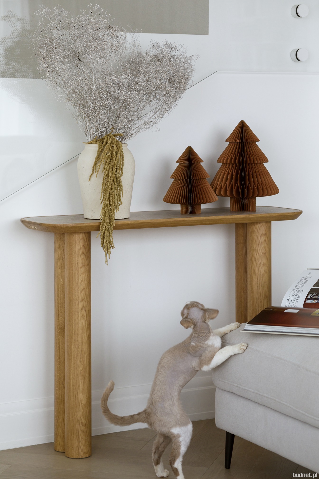 Na stoliku kawowym Katarzyna Szostakowska zastosowała kolekcję Impress, inspirowaną kwarcytem patagońskim. Wyrazisty wzór oraz głęboka zielona barwa urozmaicona beżowymi wybarwieniami sprawiają, że staje się on centralnym punktem każdego salonu. Okrągły stolik został ozdobiony płytami z kolekcji Onice Bianco Mat, nawiązującej do piękna onyksu. Złamana biel płytek przynosi skojarzenia z budzącym się o poranku niebem, tworząc wyjątkową atmosferę w każdym pomieszczeniu.