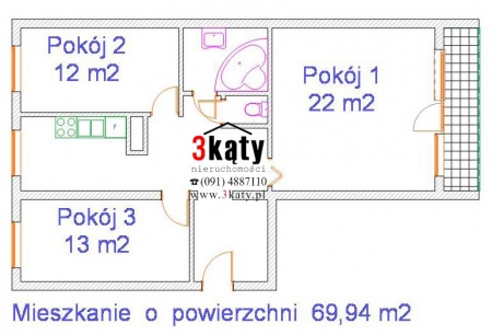 Lokal składa się z trzech pokoi (34,85m 2 , 19,5m 2 oraz 11,2m 2 ), kuchni (9,1m 2 ), łazienki (2,9m 2 ), hallu (8,09m 2 ) oraz balkonu (2m 2 ).