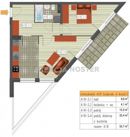 Usytuowany w budynku biurowym. Pokój z jednym pomieszczeniem, łazienka ogólnodostępna na korytarzu.