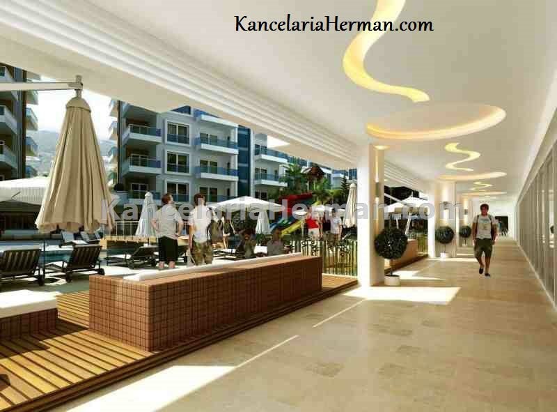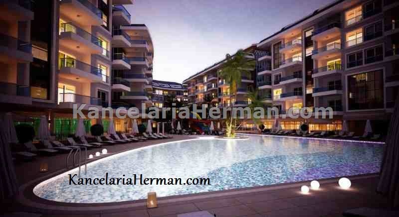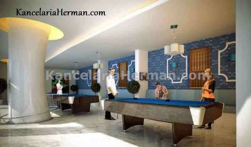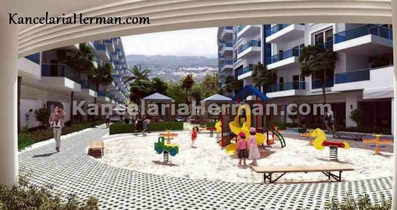 Opis kompleksu: 5 budynków mieszkalnych / 180 apartamentów, ogród z drzewami owocowymi i z palmami, galleria typu gazebo oraz grill, wewnętrzny i zewnętrzny basen kąpielowy dla dorosłych i dla dzieci, park wodny, zamknięty i otwarty plac zabaw, mini Club, centrum fitness, łaźnia turecka, sauna, łaźnia parowa, jacuzzi, gabinet, masażu, hall / Lounge, biliardy i tenis stołowy, sala gier Playstation, sala kinowa, biblioteka, market, cafe, bezprzewodowy Internet Wi-Fi, tv satelitarna, generator awaryjny, podziemny parking, ochrona 7/24 oraz system kamer nadzoru, winda.