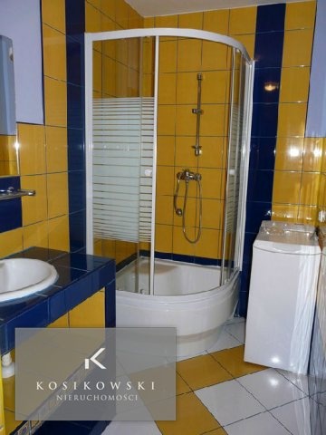 Łazienka o powierzchni ok. 5,3 m2 w całości została pokryta dwukolorową glazurą łazienkową. Znajduje się w niej nowa kabina prysznicowa, toaleta, umywalka oraz lustro.