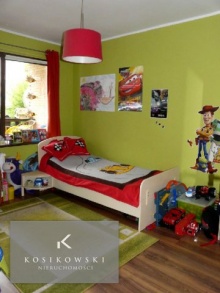 Drugi pokój o powierzchni ok. 12 m2 funkcjonuje obecnie jako pokój dziecięcy. Na ścianach znajduje się gładź tynkarska pokryta zieloną farbą lateksową oraz z naklejkami ze znanymi i uwielbianymi przez dzieci bohaterami bajek. Na podłogę położono jasne panele o wysokiej klasie ścieralności.