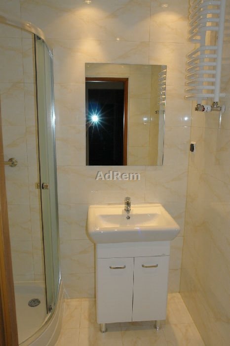 kabina prysznicowa dobrej klasy (szkło hartowane), umywalka z szafką,