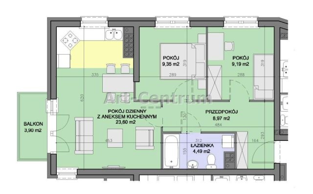 Powierzchnia pokoi [m2]: 23,60 m2 z aneksem kuchennym//9,35//9,19 |