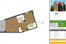 Mieszkanie składa się z: przedpokoju, salonu (z wyjściem na balkon) połączonego z aneksem kuchennym , sypialni, łazienki z WC oraz garderoby.