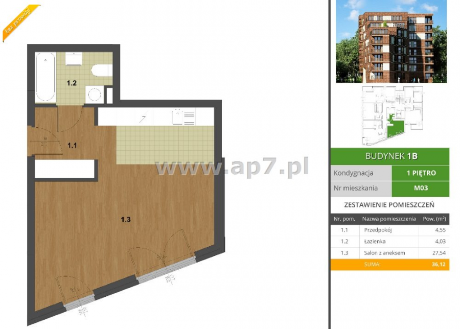 Mieszkanie składa się z: przedpokoju, salonu połączonego z aneksem kuchennym oraz łazienki z WC.