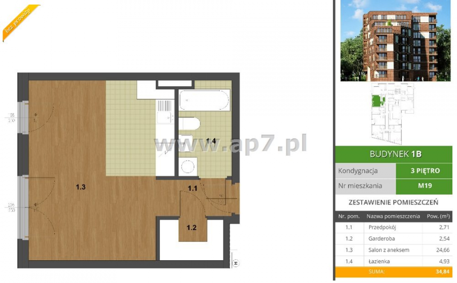 Mieszkanie składa się z: przedpokoju, salonu połączonego z aneksem kuchennym, łazienki z WC.