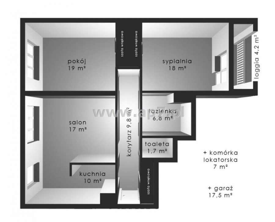 Składa się ono z przedpokoju, jasnej zabudowanej meblami na wymiar kuchni częściowo otwartej na salon, dwóch niezależnych pokoi z czego jeden z wyjściem na balkon, dużej łazienki z wc i dodatkowego wc. W przedpokoju i dwóch pokojach duże szafy garderobiane z drzwiami przesuwnymi.