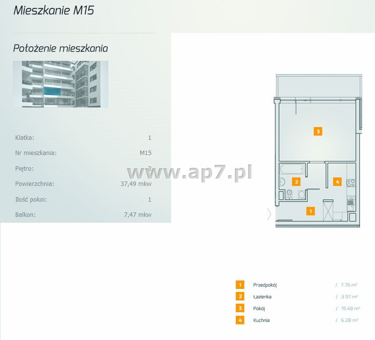 Opis wszystkich mieszkań dostępnych w apartamentowcu dostępny na naszej stronie internetowej www.ap7.pl.