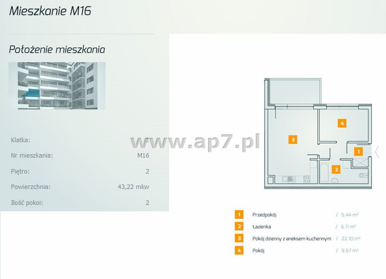 Opis wszystkich mieszkań dostępnych w apartamentowcu dostępny na naszej stronie internetowej www.ap7.pl.