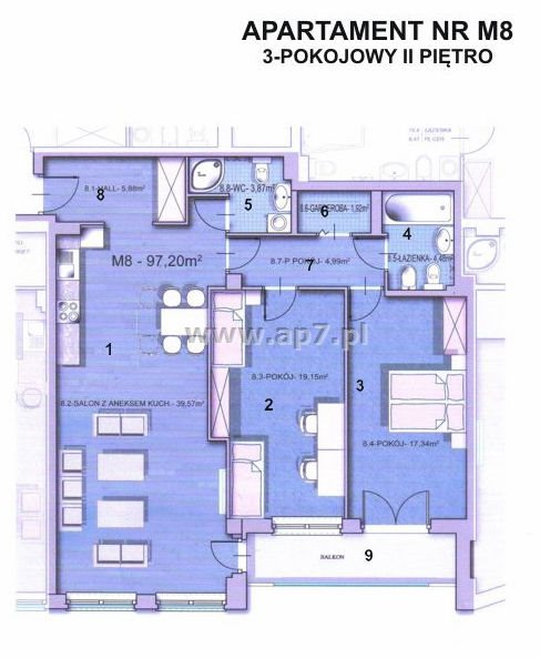Apartament składa się z: hollu, salonu z aneksem kuchennym i wyjściem na balkon, dwóch sypialni (z jednej wyjście na balkon), dwóch łazienek, garderoby oraz przedpokoju.