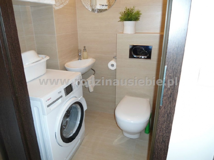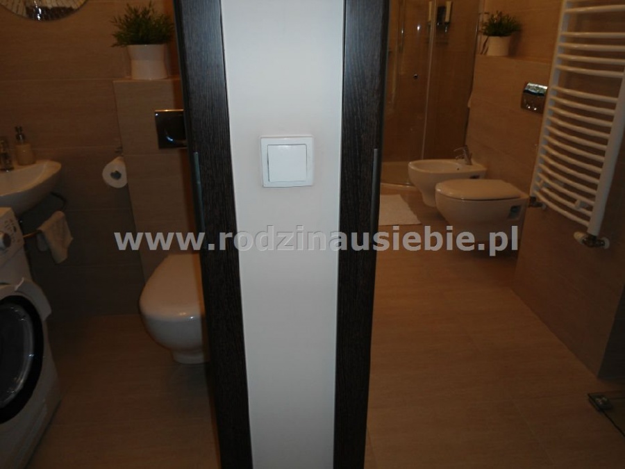 Kuchnia jest wyposażona w piekarnik, płytę indukcyjną, okap oraz zmywarkę. W dużej łazience z oknem znajduje się wanna, natrysk, bidet oraz toaleta. Apartament posiada także osobne WC w którym znajduje się toaleta i umywalka.