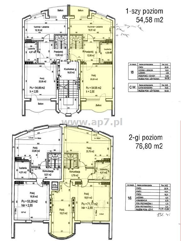 piętro I: przedpokój (12,95 m 2 ), kuchnia z jadalnią (16,81 m 2 ), przestronny salon (20,26 m 2 ), łazienka (4,56 m 2 ) oraz dwa balkony (wyjście z jadalni oraz z salonu - ekspozycja wschód - zachód).