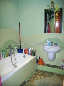 W łazience podwieszany sufit, na podłodze gumolit, a na ścianach pokrywa z tynku i granulatu styropianowego. Jest to wielki atut, gdyż łazienka spełnia wymogi użytkowe, a jednocześnie może być dostosowana do potrzeb nowych właścicieli.