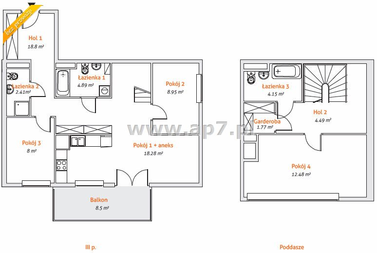 poddasze: hol (4,49 m 2 ), pokój (12,48 m 2 ), łazienka (4,15 m 2 ) oraz garderoba (1,77 m 2 ).