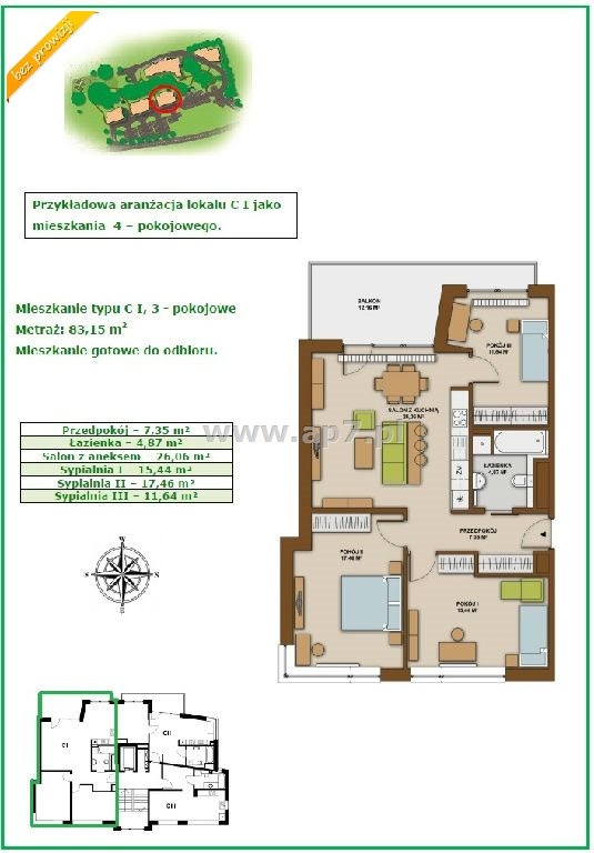 Składa się z przedpokoju (7,35 m 2 ), salonu z aneksem kuchennym (26,06 m 2 ), 3 sypialni (15,44 m 2 , 17,46 m 2 , 11,64 m 2 ), łazienki (4,87 m 2 ). Mieszkanie posiada balkon (wyjcie z salonu) o pow. 12,06 m 2 .