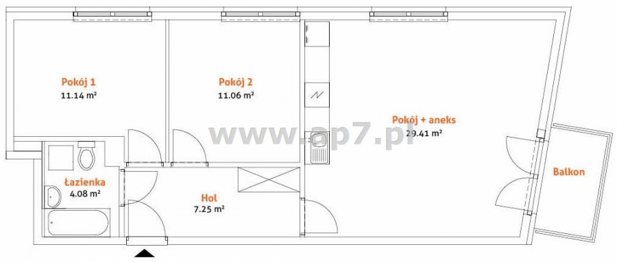 Do sprzedaży proponujemy Państwu mieszkanie 3 pokojowe znajdujące się na III pietrze w 5 piętrowym budynku. Mieszkanie o powierzchni 63,48 m2 składa się z pokoju dziennego połączonego z aneksem kuchennym (29,41 m 2 ) z wyjściem na balkon, dwóch sypialni (11,06 m 2 , 11,14 m 2 ), łazienki (4,08 m 2 ) oraz holu (7,25 m 2 ).