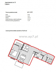 Apartament ten ma pow. 51,83m2 i składa się z: hallu, salonu z aneksem kuchennym, sypialni, łazienki oraz z pomieszczenia gospodarczego.