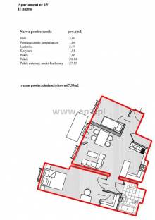 Apartament ten ma pow. 67,55m2 i składa się z: hallu, salonu z aneksem kuchennym, 2 pokoi, łazienki, korytarza z pomieszczenia gospodarczego.