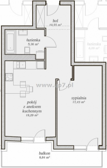 Mieszkanie składa się z salonu połączonego z aneksem kuchennym (19,29 m 2 ), sypialni (17,43 m 2 ), łazienki (5,36 m 2 ), holu (10,55 m 2 ) oraz balkonu (9,84 m 2 ).