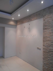 Na podłogach dąb wędzony Arabica oraz gres. Łazienka w gresie. Na ścianach gładzie gipsowe pomalowane na neutralne kolory oraz kamień naturalny. W kuchni nie ma zabudowy.