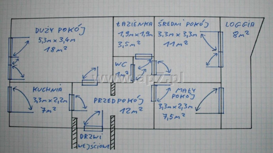 Składa się z przedpokoju (12 m 2 ), salonu (18 m 2 ), dwóch pokoi (11 m 2 , 7,5 m 2 ), kuchni (7 m 2 ), łazienki (3,5 m 2 ), osobnej toalety (1 m 2 ) oraz loggii (9 m 2 ).