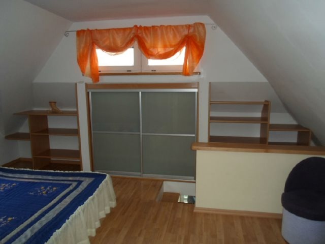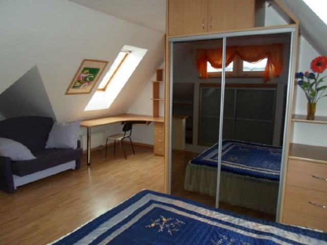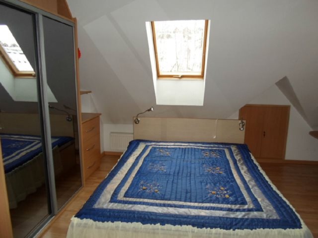 Na górze open space z szafami wnękowymi, dużym łożem i biurkiem, dodatkowo 2 lukarny.