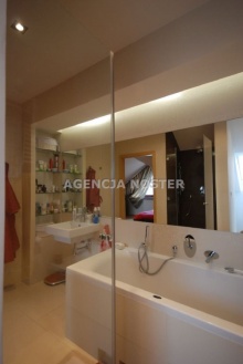 Polecamy Państwu elegancki, wygodny apartament położony w bardzo ładnym osiedlu z tarasem od zachodu z rozległym widokiem. Apartament położony jest na pierwszym piętrze. Pierwsza kondygnacja- to przestrzeń na której mamy salon z kominkiem, wyjściem na taras / trzy skrzydła drzwi / otwartą kuchnię i jadalnię. Na drugiej kondygnacji znajdują się 2 sypialnie, pokój kąpielowy / wanna, kabina prysznicowa / oraz garderoba-na tym poziomie są skosy. W przyziemiu budynku znajduje się garaż, kotłownia oraz pomieszczenie ok. 20mkw które może służyć jako pomieszczenie gospodarcze lub jako np. pokój rekreacyjny z siłownią. Na podjeździe dodatkowe miejsce parkingowe