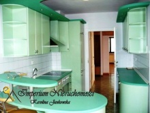 Kuchnia bardzo ładnie zabudowana i wyposażona w bogate sprzęty AGD (zmywarka, lodówka, piekarnik oraz płyta grzewcza elektryczna), na podłodze wykończona terakotą.