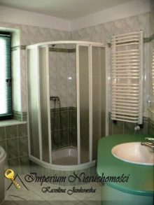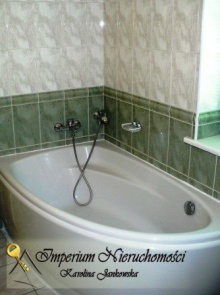 Łazienka wyposażona w wannę narożną oraz kabinę prysznicową. Na podłodze położona jest terakota, na ścianach glazura.