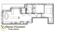 Składa się z salonu salonu z aneksem kuchennym (28m2),dwóch sypialniani z garderobą (15m2,10m2),łazienki 6,4m2,oraz drugiej łazienki 3,47m2 ( obie z oknem),przestrzennego holu z korytarzem (13,8m2). Z salonu jest wyjście na przytulną dużą loggie (9,3m2).