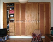 W pokoju jest drewniana szafa wbudowana na całą szerokość ściany.