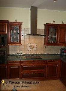 Na podłogach w salonie i sypialni leży drewno egzotyczne merbau w łazience, kuchni i przedpokoju terakota.