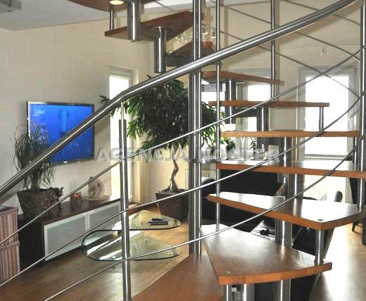 Na pierwszym poziomie salon z kuchnią, jadalnią, dekoracyjne schody na następne piętro, na dole również dwie sypialnie oraz garderoba i łazienka. Kuchnia zabudowana ze sprzętem AGD.