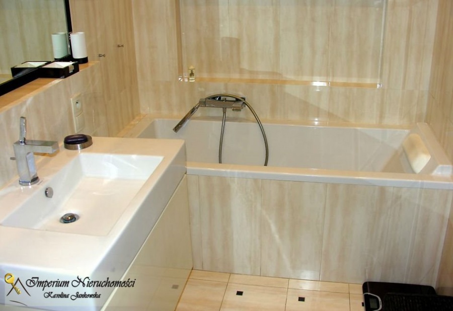 W łazience wanna oraz kabina natryskowa.