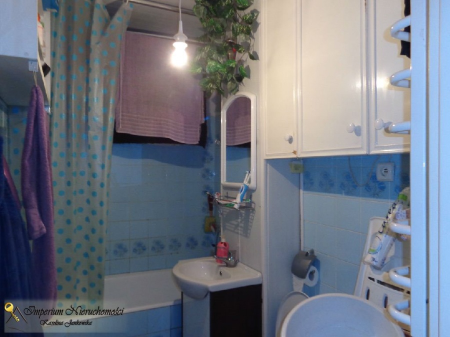 Łazienka razem z WC i wanną , wymaga niewielkiego remontu ze względu na fakt, iż posiada stare płytki zarówno na ścianach jak i na podłodze.