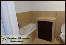 Łazienka wykończona jest płytkami ceramicznymi, wyposażona w wannę i kabinę prysznicową, szafki łazienkowe, obudowaną pralkę.