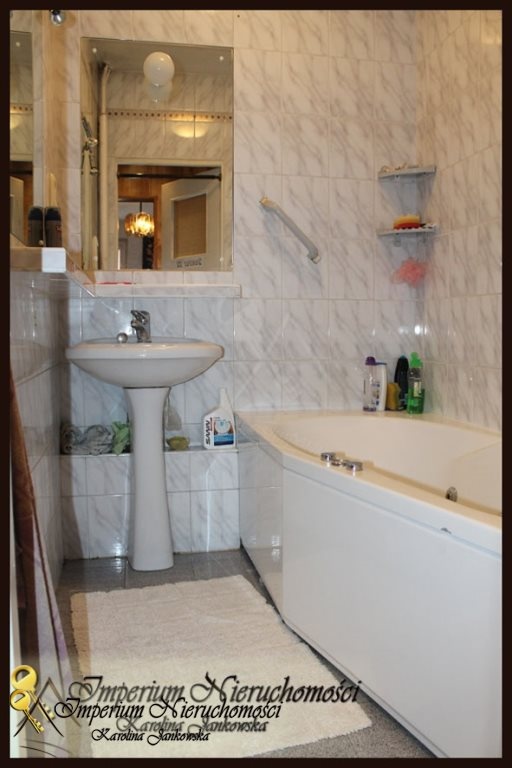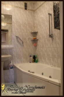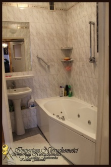 Ściana w kuchni, łazience oraz częściowo w WC wyłożona glazurą, łazienka z dużą wanną z hydromasażem, na podłodze terrakota.