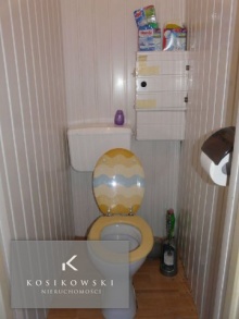 Oddzielnym pomieszczeniem jest toaleta o powierzchni ok. 1 m2. W całości została pokryta jasnymi panelami ściennymi.