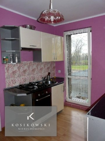 W kuchni o powierzchni ok. 7 m2 na ścianach położono gładź tynkarską pomalowaną w wyrazistych kolorach oraz kafle z motywami kwiatowymi, natomiast na podłodze znajdują się jasne, kontrastujące panele. Wnętrze rozjaśniają promienie wpadające przez drzwi balkonowe. Pomieszczenie to stanowi bardzo funkcjonalną przestrzeń. W jego wyposażeniu pozostają meble kuchenne, kuchenka z piekarnikiem, okap oraz zlewozmywak.