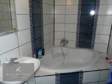 Łazienka zajmuje powierzchnię ok. 5 m2, w całości pokryta została dwukolorową terakotą łazienkową. W pomieszczeniu mieści się narożna wanna, a także umywalka.