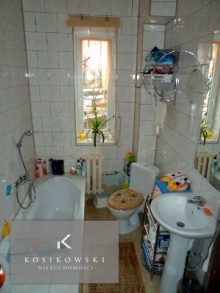 Łazienka o powierzchni ok. 3,7 m2. Na wyposażeniu znajduje się : umywalka, WC i wanna. Ściany i podłogę wyłożono płytkami ceramicznymi w jasnym kolorze. W pomieszczeniu znajduje się duże okno, dzięki czemu pomieszczenie jest bardzo jasne.