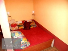 Drugi pokój o powierzchni ok. 20 m2 jest podzielony ścianką regipsową na dwie części: większa stanowi salon, a mniejsza sypialnię. W pomieszczeniu jest duże okno PCV, podłogi wyłożono panelami, a ściany pomalowane są w kolorze bordowym, pomarańczowym brzoskwiniowym.