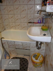 Łazienka o powierzchni 5m2, podłoga i ściany pokryte kaflami. Wyposażenie: wanna, umywalka. Osobnym pomieszczeniem jest WC o powierzchni 1m2 co stanowi bardzo funkcjonalne rozwiązanie.