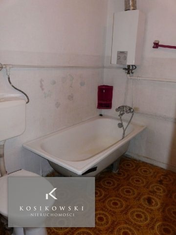 Łazienka zajmuje powierzchnię ok. 3 m2, wyposażona jest w wannę oraz toaletę, a także piecyk gazowy. Ściany częściowo pokryto tapetą, a na pozostałej części znajduje się tynkiem tradycyjny. Na podłodze położono wykładzinę PCV.