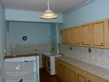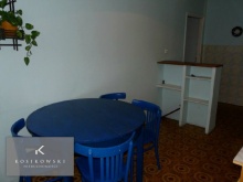 W kuchni o powierzchni ok. 13 m2 znajdują się meble w odcieniach jasnego brązu, stół, krzesła, kuchenka oraz zlewozmywak z baterią. Ściany częściowo pokryto kaflami w odcieniach bieli oraz kremu, pozostała część utrzymana jest w barwach błękitu. Doskonale kontrastuje to z wykładzina PCV w odcieniach brązu. Pomieszczenie jest duże i funkcjonalne, jego wnętrze można zmodyfikować w zależności od kreatywności i oczekiwań przyszłych właścicieli.