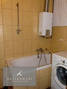 W łazience o powierzchni ok. 3 m2 znajduje się wanna, toaleta oraz pralka. Ściany pokryto w znacznej części jasnymi kaflami, pozostałe fragmenty pokrywa tynk pomalowany na kolor biały. Na podłodze położono brązowe kafle, razem te elementy tworzą interesujące i oryginalne połączenie.