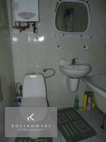 W łazience o powierzchni ok. 4 m2 znajduje się wanna, umywalka oraz WC. Ściany pokryte są boazerią PCV, a na podłodze znajdują się kafle. Dodatkowo w tym pomieszczeniu zamontowano piec gazowy, który podgrzewa wodę.