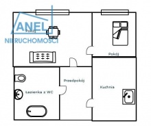 Istnieje możliwość usunięcia ścianki działowej między sypialnią, a kuchnią, dzięki czemu można uzyskać kawalerkę z dużą kuchnią z oknem.